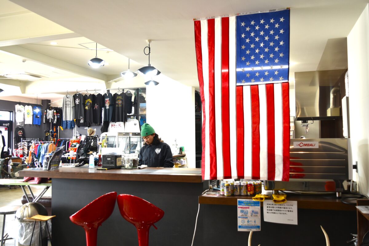 「a Blue Leaf」は、2023年11月にオープンしました。ファーマーでもあるオーナーの白石さん(当日は不在)は、この場所でバイクショップを開くつもりでした。しかし安平町は高齢化率37.3%の街。バイクの販売だけでは、多くのお客さんは見込めません。仲間たちから「カフェを主体にしたほうが入りやすいよね」「バイクがある環境をみんなで楽しみたいよね」というアイデアが寄せられ、バイクの販売、カスタム、飲食やアパレル販売というスタイルが確立しました。