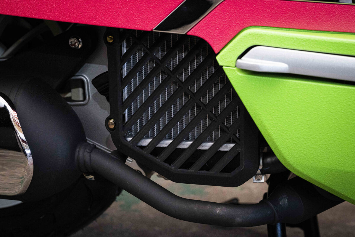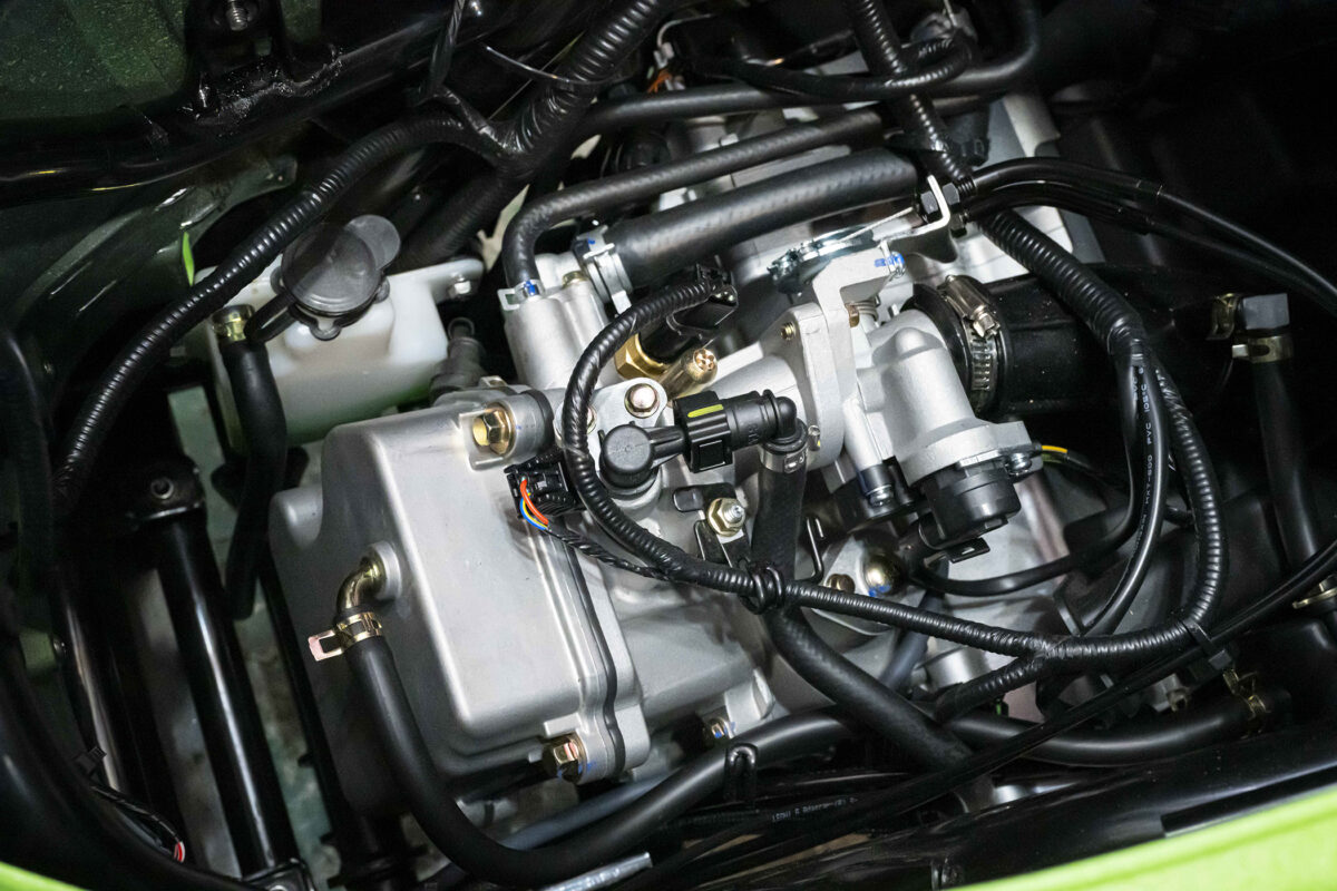エンジンはSOHCの水冷単気筒で、シリンダーは水平に近い角度で前傾しています。