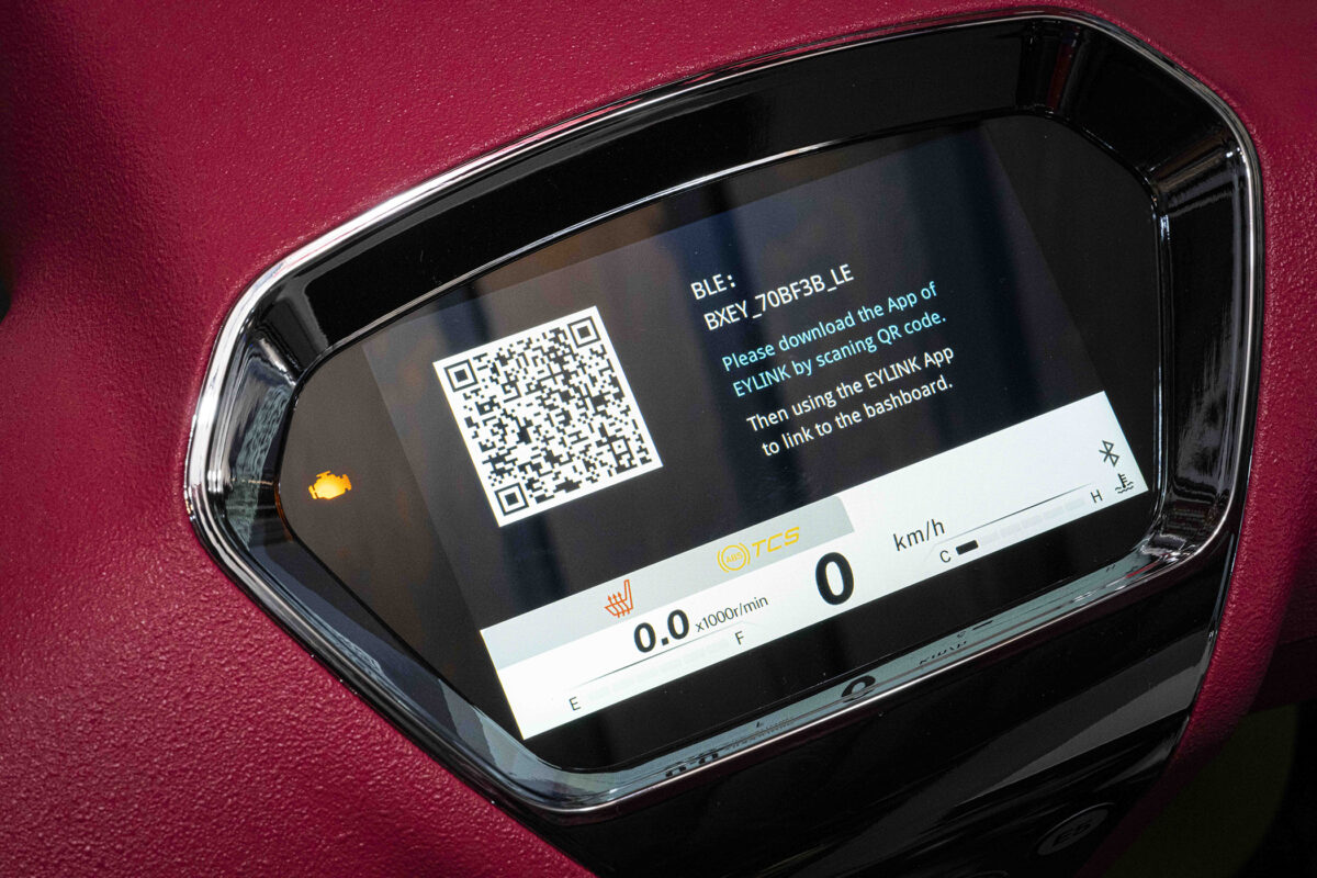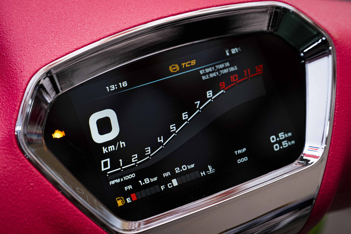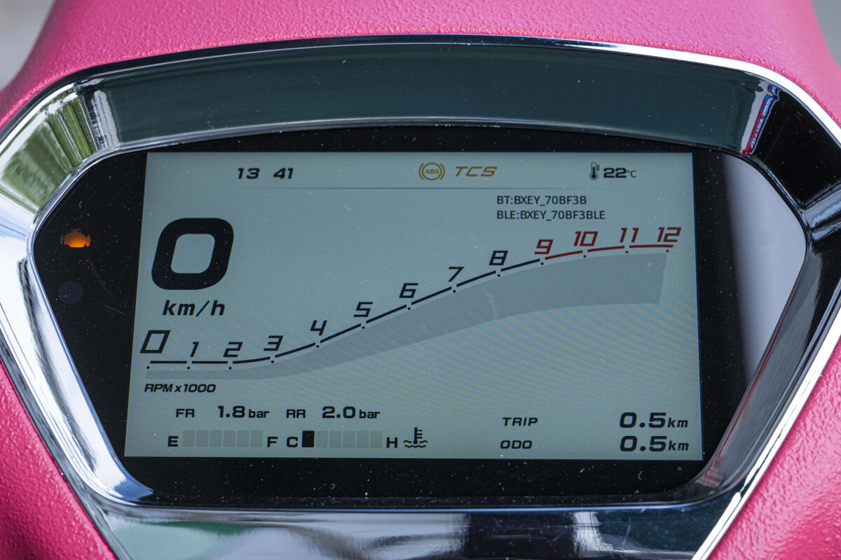 メーターはフルカラーの液晶ディスプレイを採用しています。タイヤの空気圧表示やTCS(トラクションコントロール)、ABS、ヒーターの動作状態、外気温など多彩な表示内容です。アプリを使ってスマートフォンと連携することも可能です。