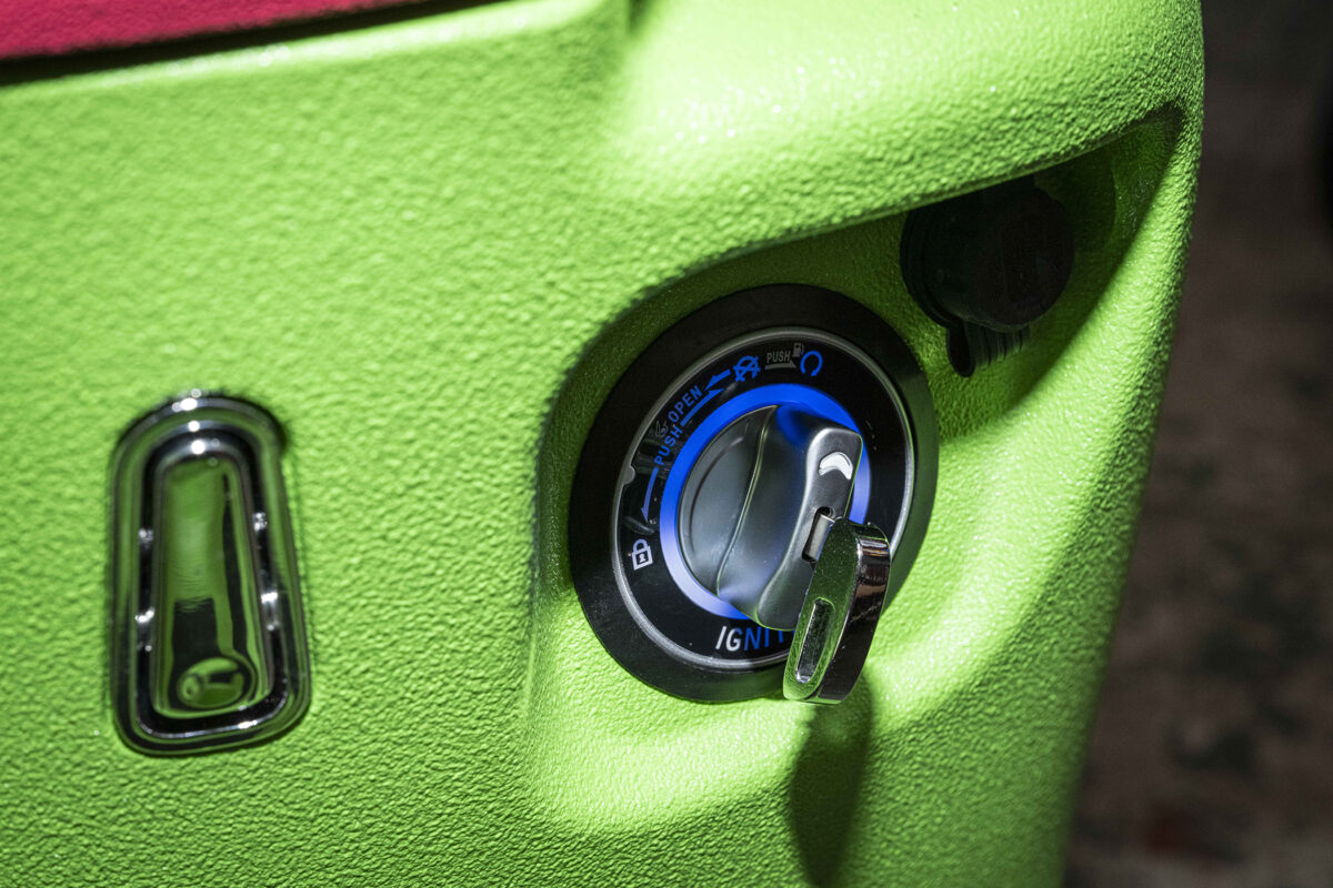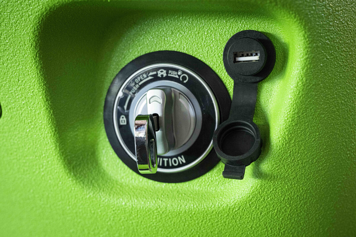 キーシリンダーの脇にはUSB-Aの充電ポートを備えているのでスマートフォンの充電も簡単に行えます。写真ではキーを挿していますが、スマートキーを採用しているので実はキーを挿さなくてもOK。また、キーシリンダーの文字や絵柄の部分は蓄光塗料を使っていることもポイントです。