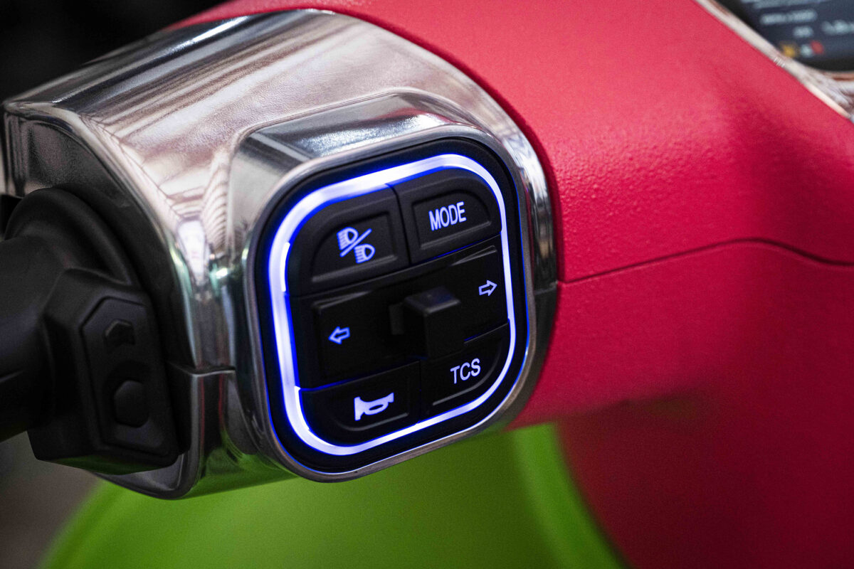 スイッチボックスは左右ともにバックライト付き。左側のスイッチにはウインカー、ロー/ハイビーム、ホーン、モード、TCS(トラクションコントロール)のスイッチを配置。さらに左側のグリップ根本にはグリップヒーターのスイッチを一体化させています。右側のスイッチにはハザード、シートヒーターをはじめ、メーターの操作ボタンを配置しています。