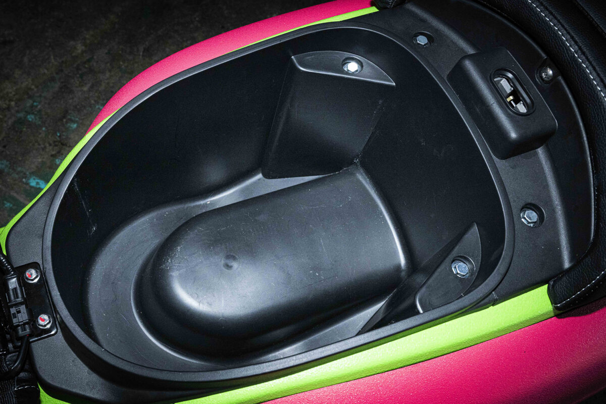 シート下の荷室にはジェットヘルメットなら楽々収納できる十分な容量です。シートの開閉はキーシリンダーを左に回すとロックが解除されるので、ワンタッチで行えます。