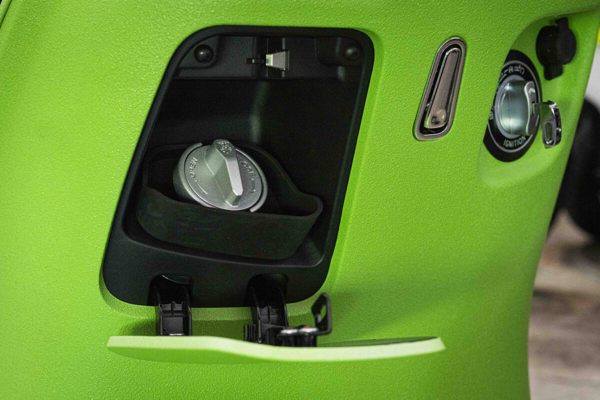イグニッションキーのシリンダーにもバックライトを装備しているので夜間でも迷わず操作できます。給油口はフロントボックスの左側に配置。キーを右に押しながら回すとカバーが開く仕組みです。キーシリンダー左側にあるシルバーのパーツはコンビニフックです。