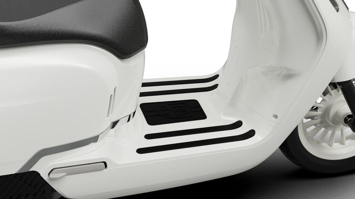 角形のヘッドライトを起点に、直線的な面構成でリアエンドまでまとめたデザイン。どこかクラシックな香りを漂わせつつも、現代のスクーターであることを訴えかける洗練された外装が魅力的です。エンジンについても見える部分はきちんとデザインされているんも印象的です。ゆったりとしたホイールベースに12インチホイールをセットする車体は、街中での乗り心地にも期待ができます。もちろん、ブレーキにはABSを採用しているので、安全性にも抜かりなし。