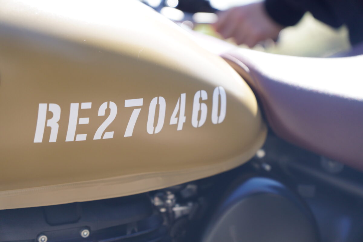 タンクのデザインも気に入っていて、同じクラシック350でも、この番号(REから始まる個体番号)は1台1台違うんです。それが唯一無二な部分で、自分のバイクの特徴になっていますね。