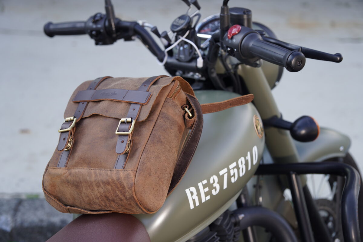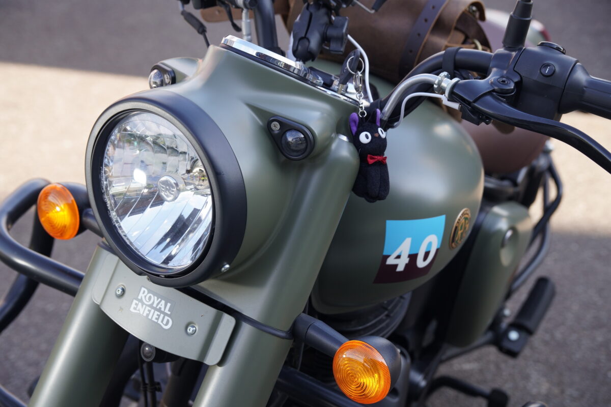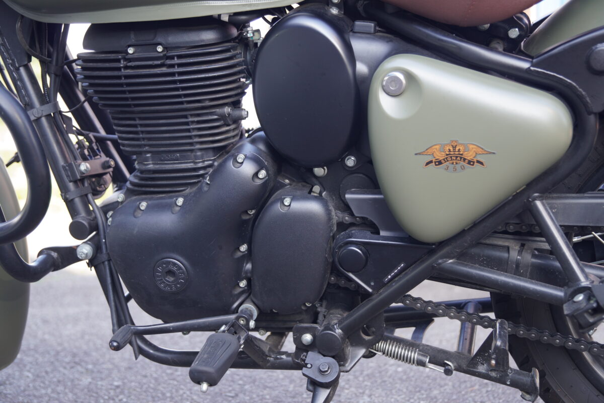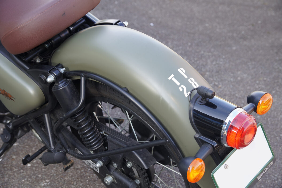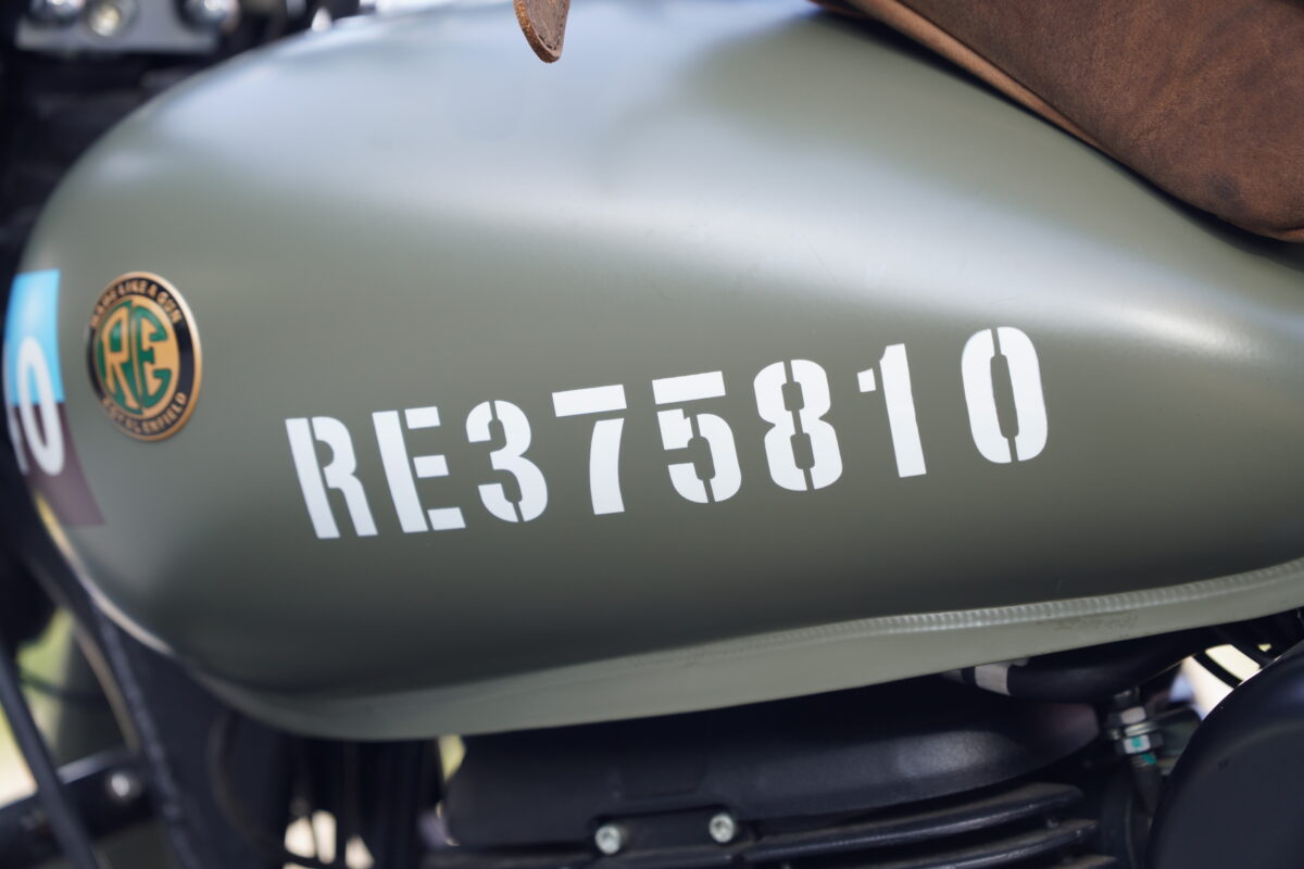 フォルムが丸くてメカっぽい雰囲気ですね。タンク横にRE(=Royal Enfield)から始まる個体ごとに違う番号が付いているところも気に入っています。国産車にはない遊び心ですよね。