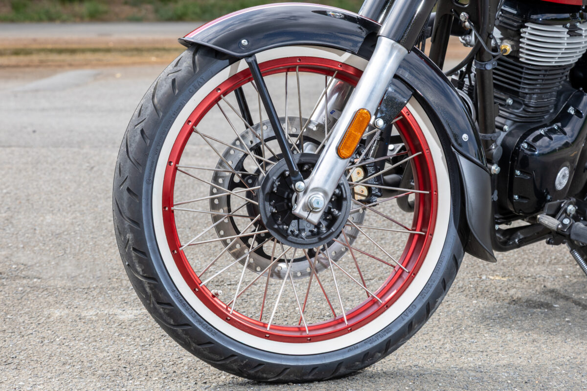 チューブレスタイヤを採用していて、タイヤ側⾯を⽩くデザインしたホワイトウォール‧タイヤが特徴的。