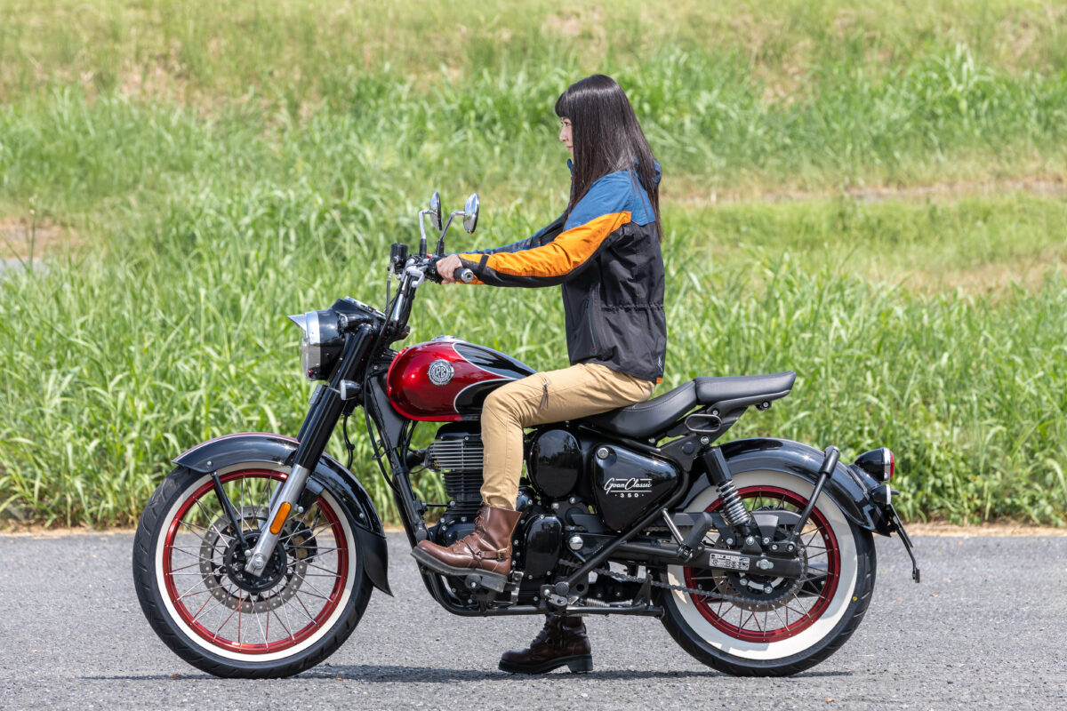 跨ってまず感じたのは、足つき性の良さでした! ボバースタイルのGOAN CLASSIC 350は、シートが750mmと低めなこともあり、163cmの私で両足がべったり地面に接地します。 車両重量も197kgと400㏄クラスの中では軽めな部類に入ると思います。車体の大きさや重さ、自分の体格とのギャップを感じないので、跨っただけで安心感を感じられるのが特徴です。