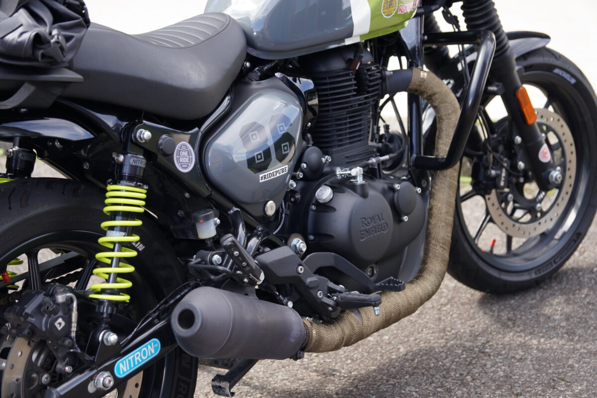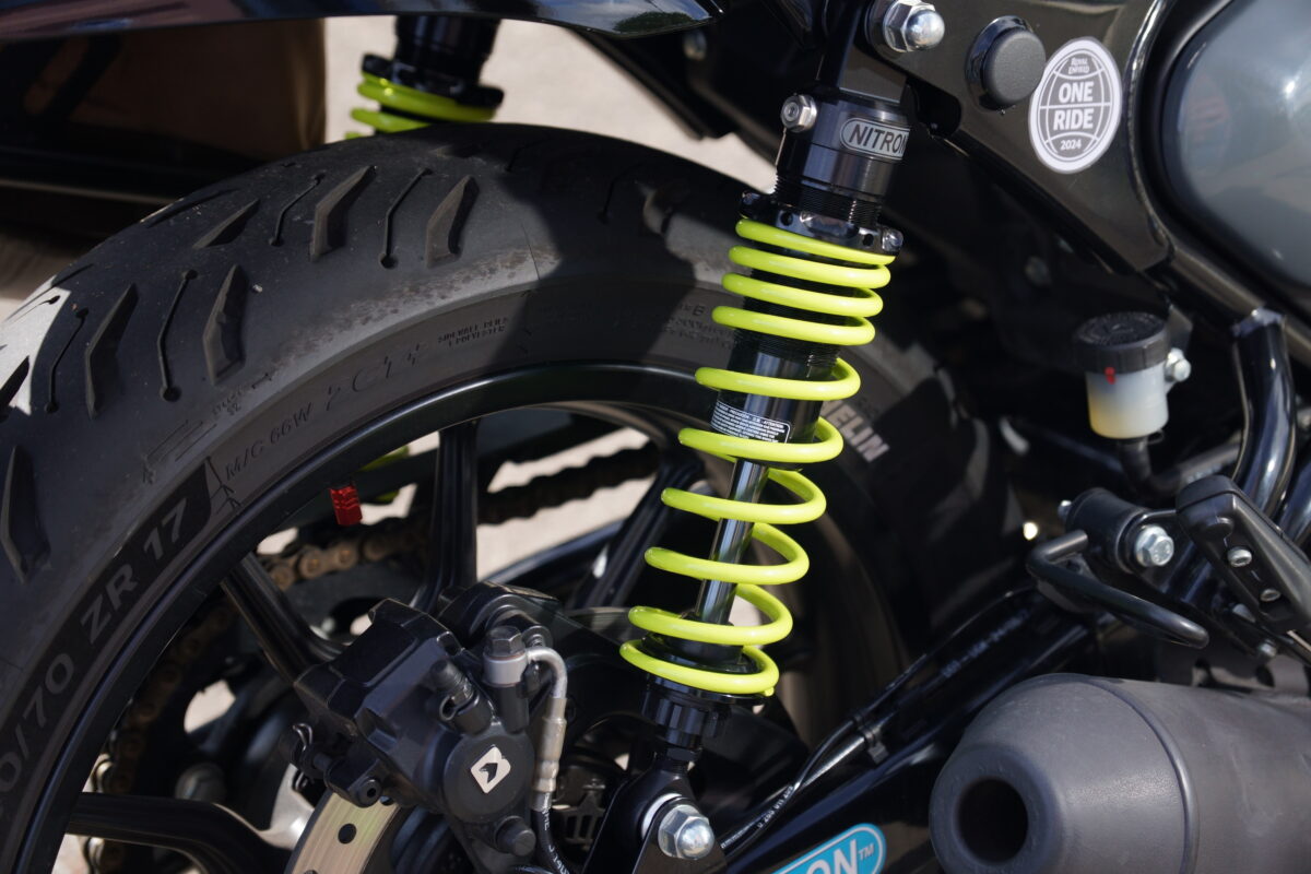 リヤにはナイトロン製のサスペンションを装着しています。ロイヤルエンフィールドにナイトロンのサスペンションを選ぶ人は少なく、周囲ではオーリンズを選ぶケースが多い中、あえてナイトロンを選択しました。