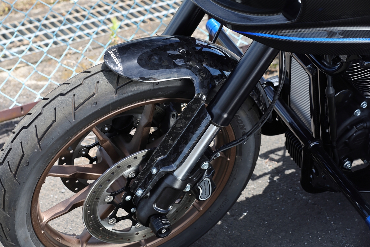 さらに、前後フェンダーやサドルバッグカバー、タンクコンソールなど、タンク本体を除くほとんどの外装パーツを「SPEEDRA」のカーボンパーツに交換している。