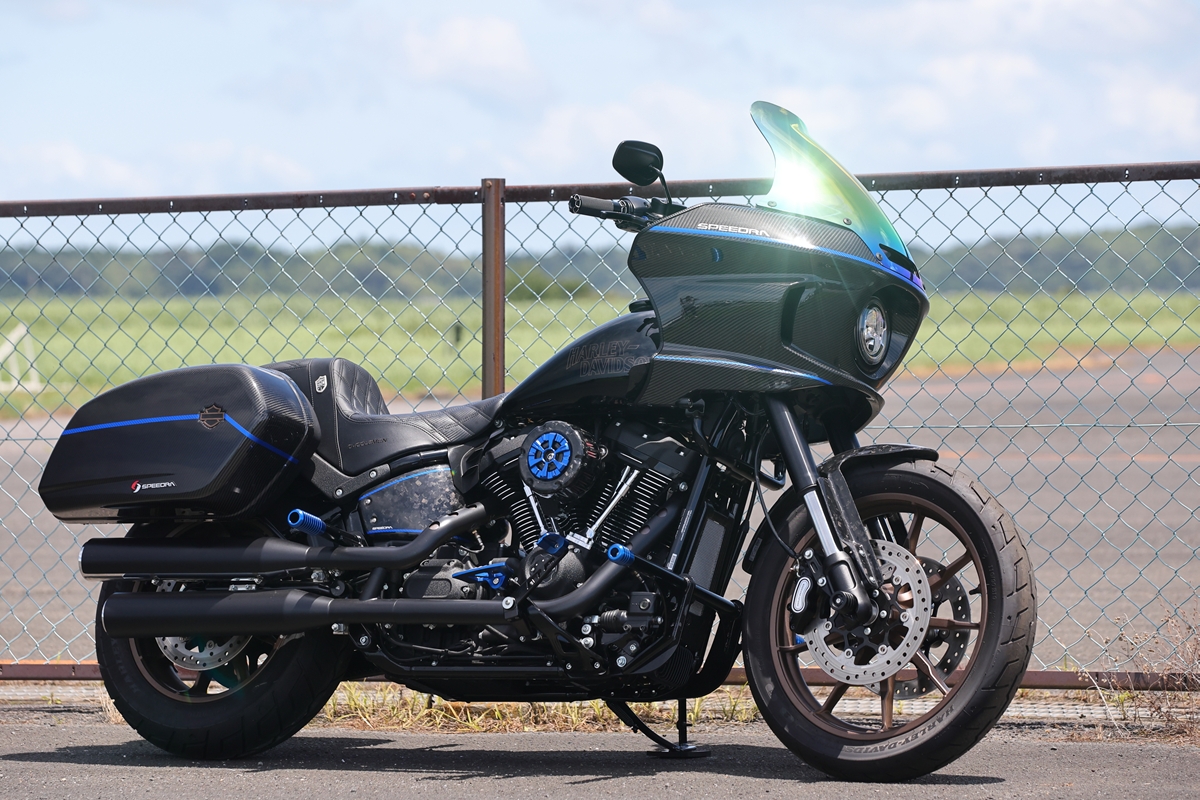従来のスタイルにとらわれず、より走りを意識した最新のハーレーカスタムに対応するSPEEDRA(スピードラ)のパーツ群。軽量・高剛性なドライカーボンと、機能性とデザイン性を兼ね備えたアルミビレットパーツは、ルックスだけでなく性能面でも確かな効果を発揮する。