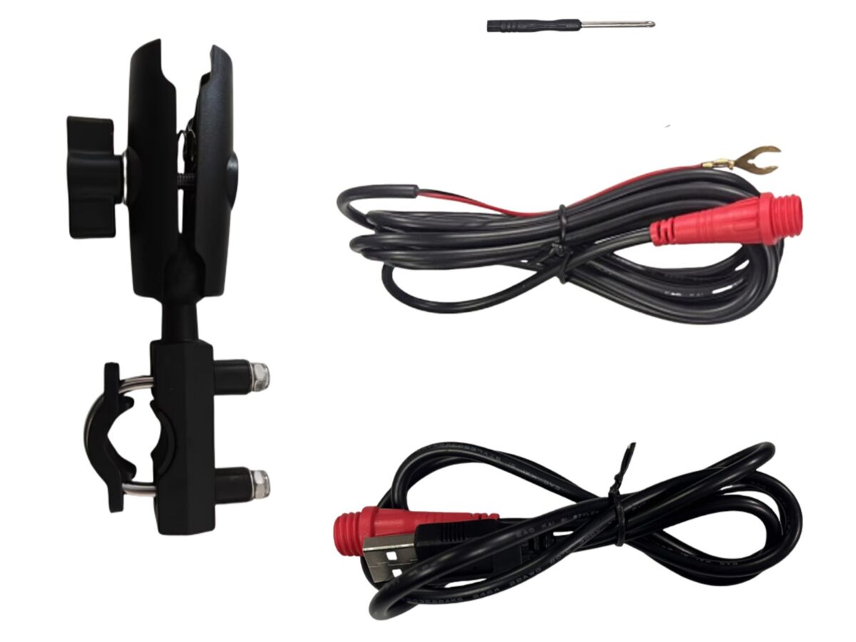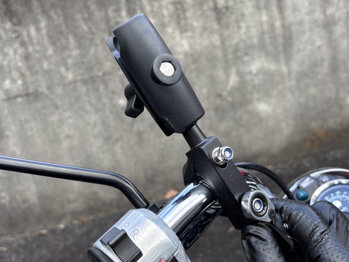 バイクへの取り付けも10mmレンチがあればOK。外径22.2mmの一般的なバーハンドルはもちろん、大径のファットバーやアメリカ規格のハンドルにも対応している。電源はUSBポート(Type-A)に接続するだけだ。