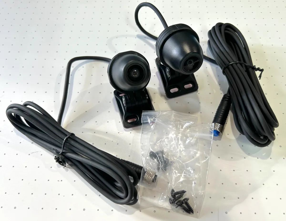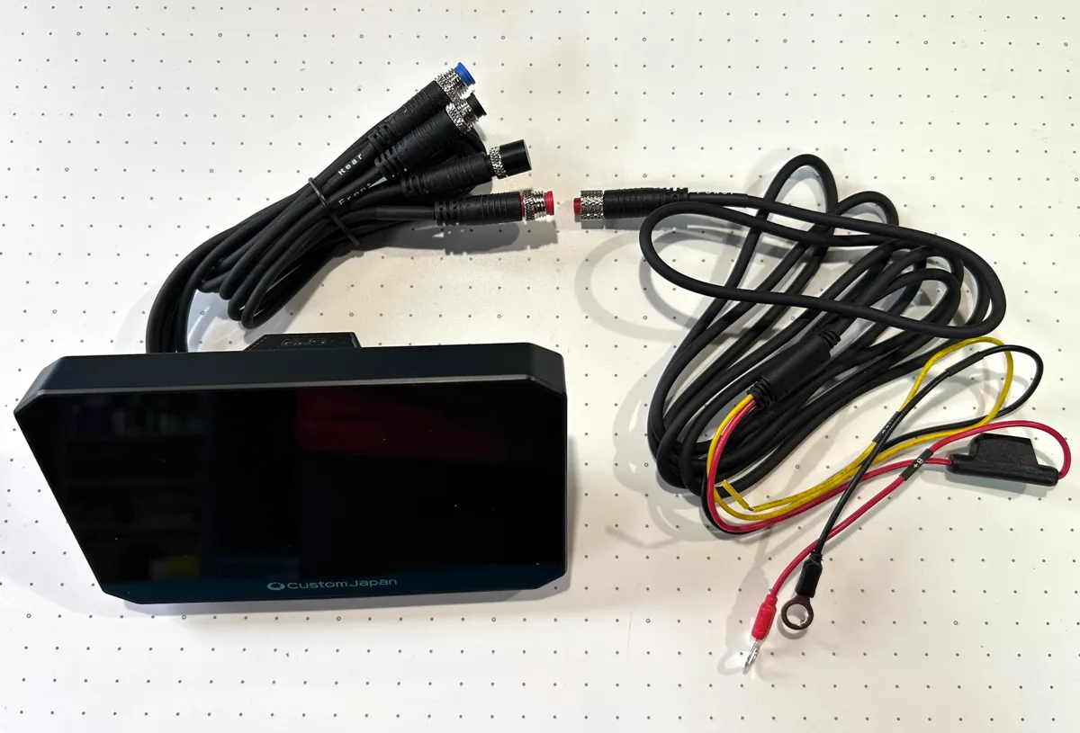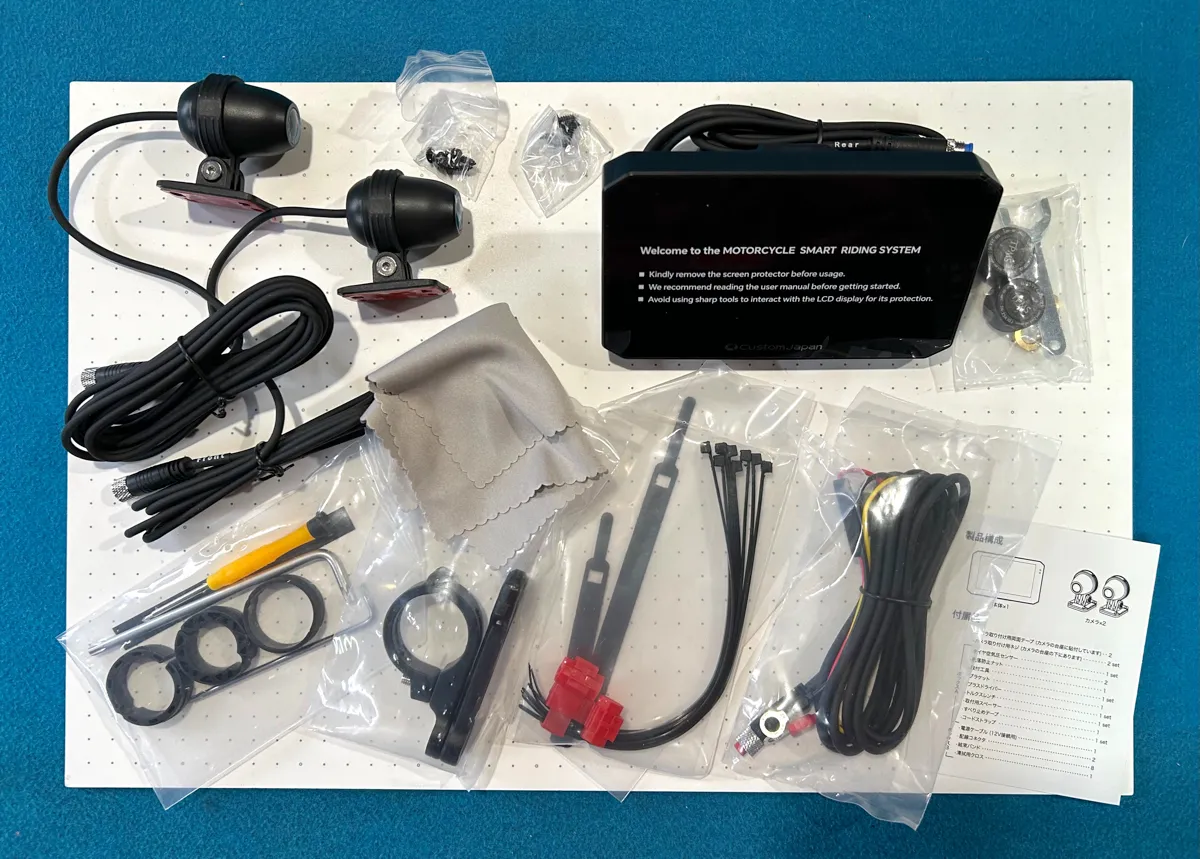 いかにも「ハイエンドモデル感」が溢れるパッケージを開封すると、中から出てきたのは「本体、前後ドラレコカメラ、TPMS、電源ケーブル、ハンドルマウント、必要な工具と結束バンド、簡易説明書(ネットで見る系)」でございました。