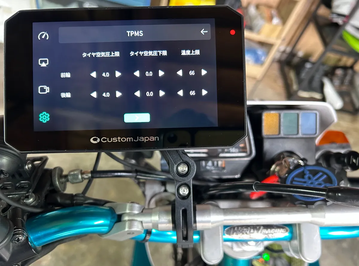 ちなみに空気圧の単位としては「bar・psi」の2種類が用意されており、上限と下限の数値を設定することで過度に空気圧が低い・もしくは高い時に警告表示をしてくれます(有能ですなぁ)