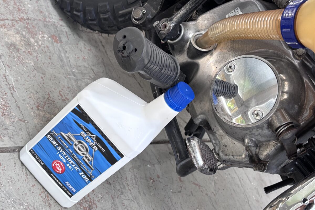 もはやエンジンオイル添加剤の代名詞ともいえる「スーパーゾイル」。その効果は後述するが、今回使用したオイルは4ストエンジン用のスーパーゾイル成分があらかじめ配合された半合成油「セミシンセティックゾイル」だ。