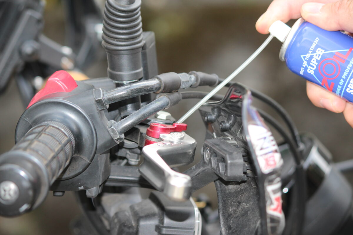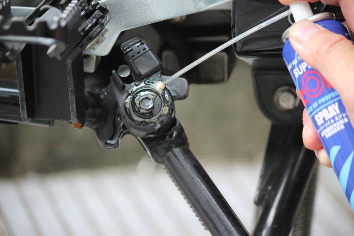 スタンド系は雨や泥が接続部にかかりオイル切れを起こすことが多いので一番分かりやすい部分だ。もしオフロードなどを走っている場合は、事前に泥や砂を流してからオイルを吹くようにしたい。