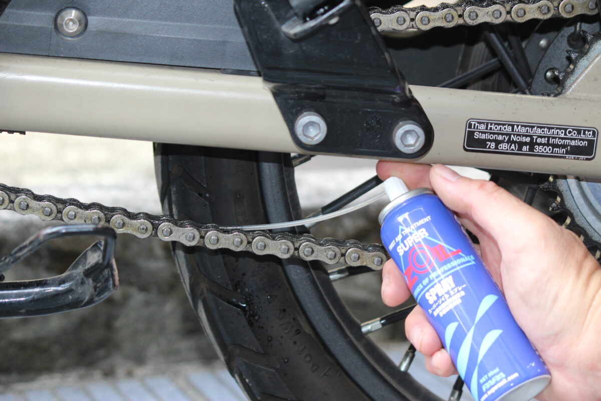 スーパーゾイルのラインナップには「チェーンルーブ」があるので、本来ならドライブチェーンにはそのオイルを吹くべきだが、試しにホンダCT125ハンターカブのチェーンに塗布してみたところ、すぐに浸透し、滑らかな潤滑効果が実感できた。また、このスプレーは、金属だけでなく樹脂やゴム部にも問題なく吹けるのがありがたい。
