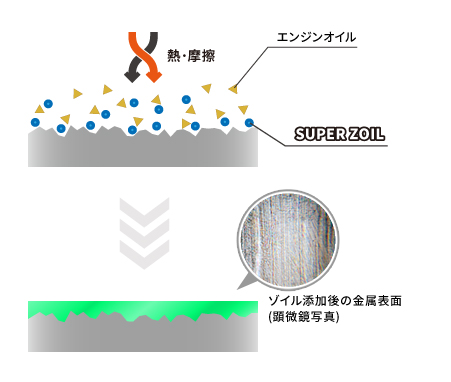 それに対し、スーパーゾイルは「金属表面を再形成するトリートメント剤」というのが大きな違いだ。熱と摩擦による化学反応で金属表面を極めてなめらかな状態に再生し、オイルの循環に最適な状態を生み出しているのだ。化学反応により金属表面を作り変えているので、その分耐久性も高くなるというわけ。