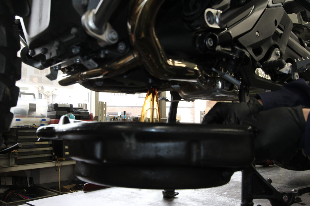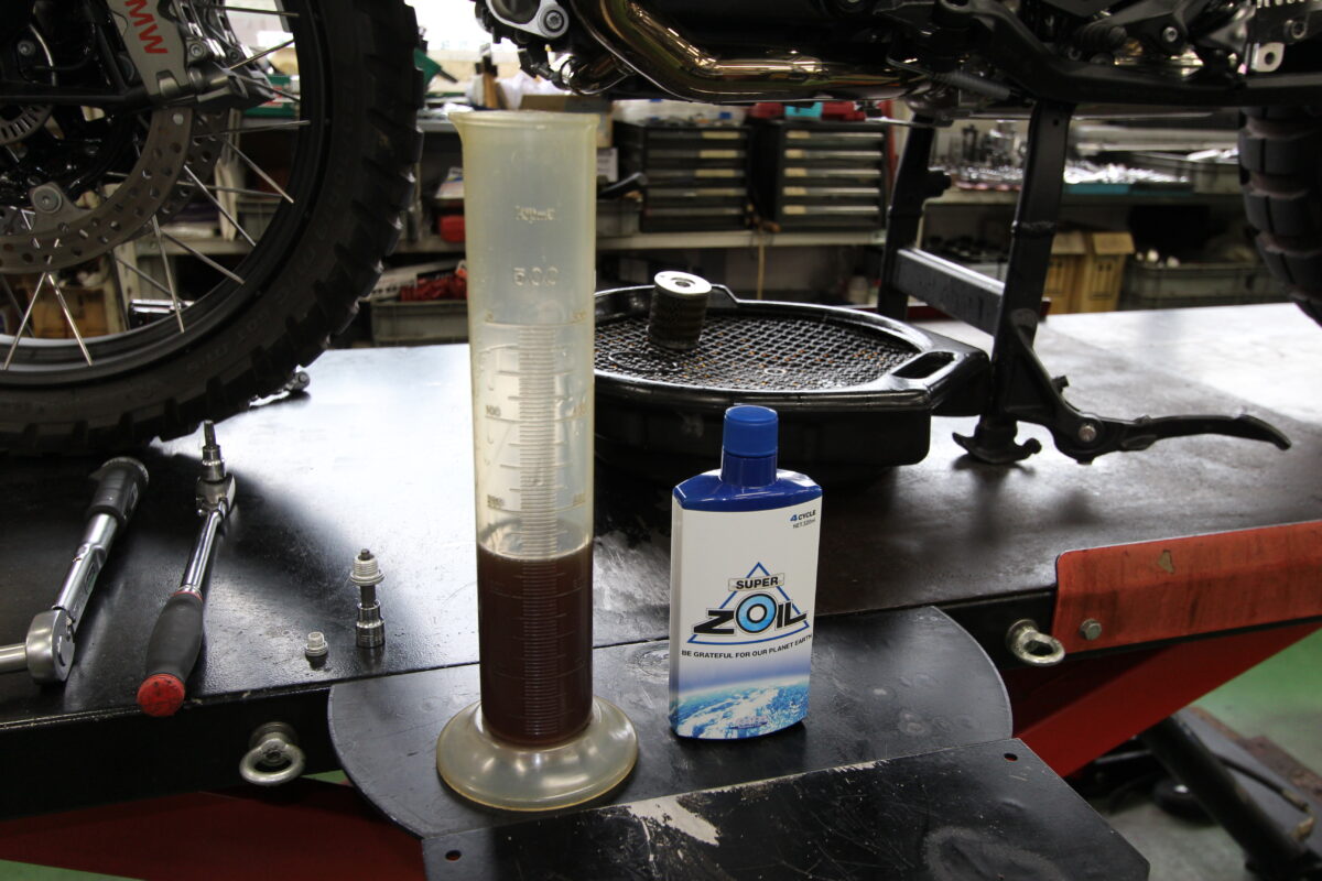 エンジンオイルの交換は通常通り。ある程度バイクを走行させエンジンの温度を上げ、オイルの粘度を下げる。オイルを抜いて、交換する新しいオイルは規定量からスーパーゾイルを添加する分だけマイナスし、そこにスーパーゾイルを足すだけだ。