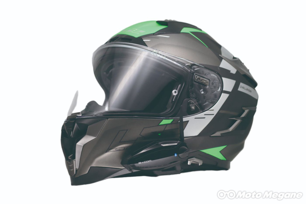 B+COMの取付解説は現在はSHOEI、Arai、KABUTOのみだが、実際にはいろいろなヘルメットに取り付けられる汎用性を備えている。ヘルメットの形状に合わせて取り付けられるマウントも用意されているので、愛用のヘルメットにも付けてみよう!装着したLS2 CHALLENGER Fの場合は、標準のマウントで簡単に取付けができた。