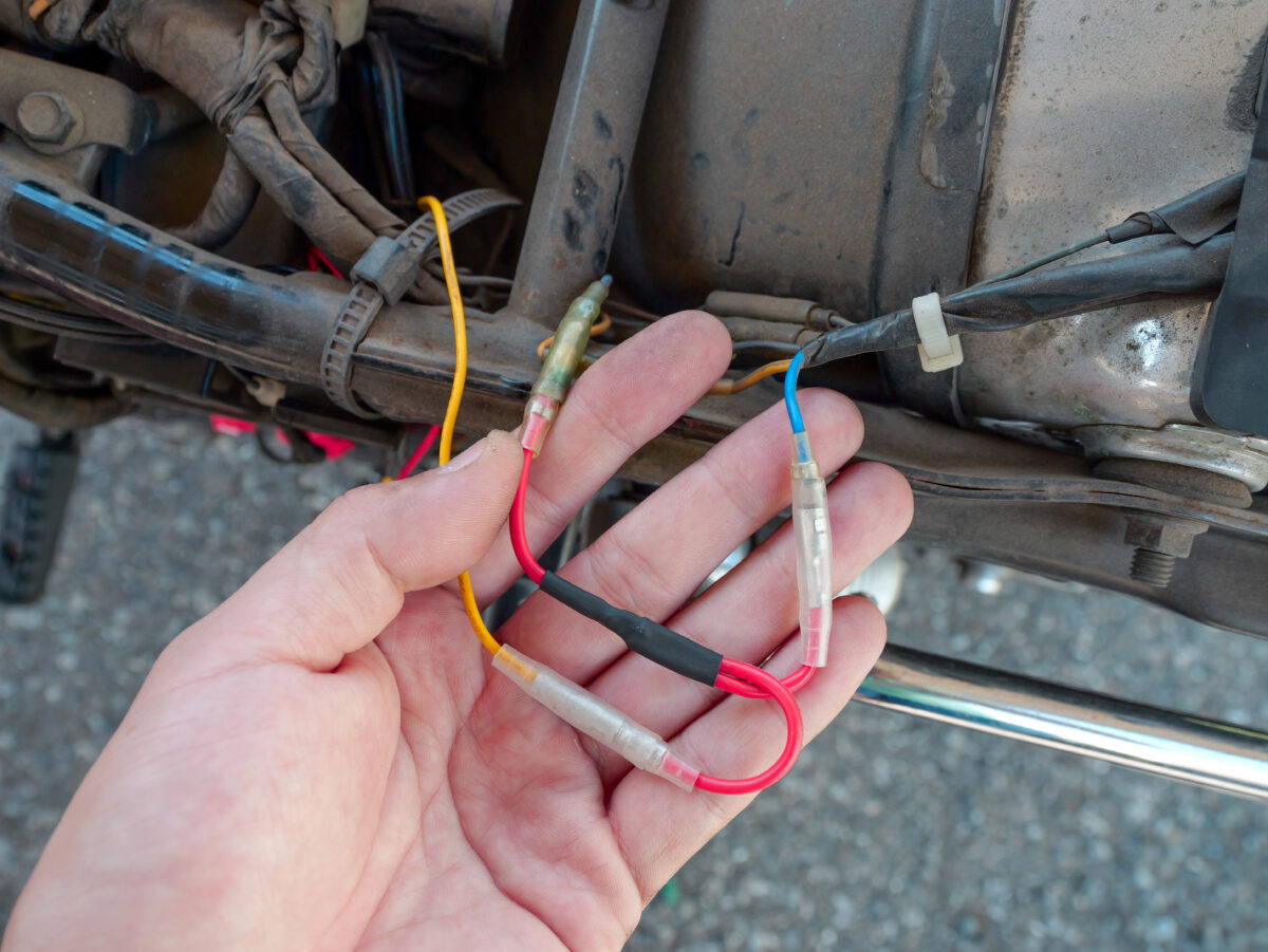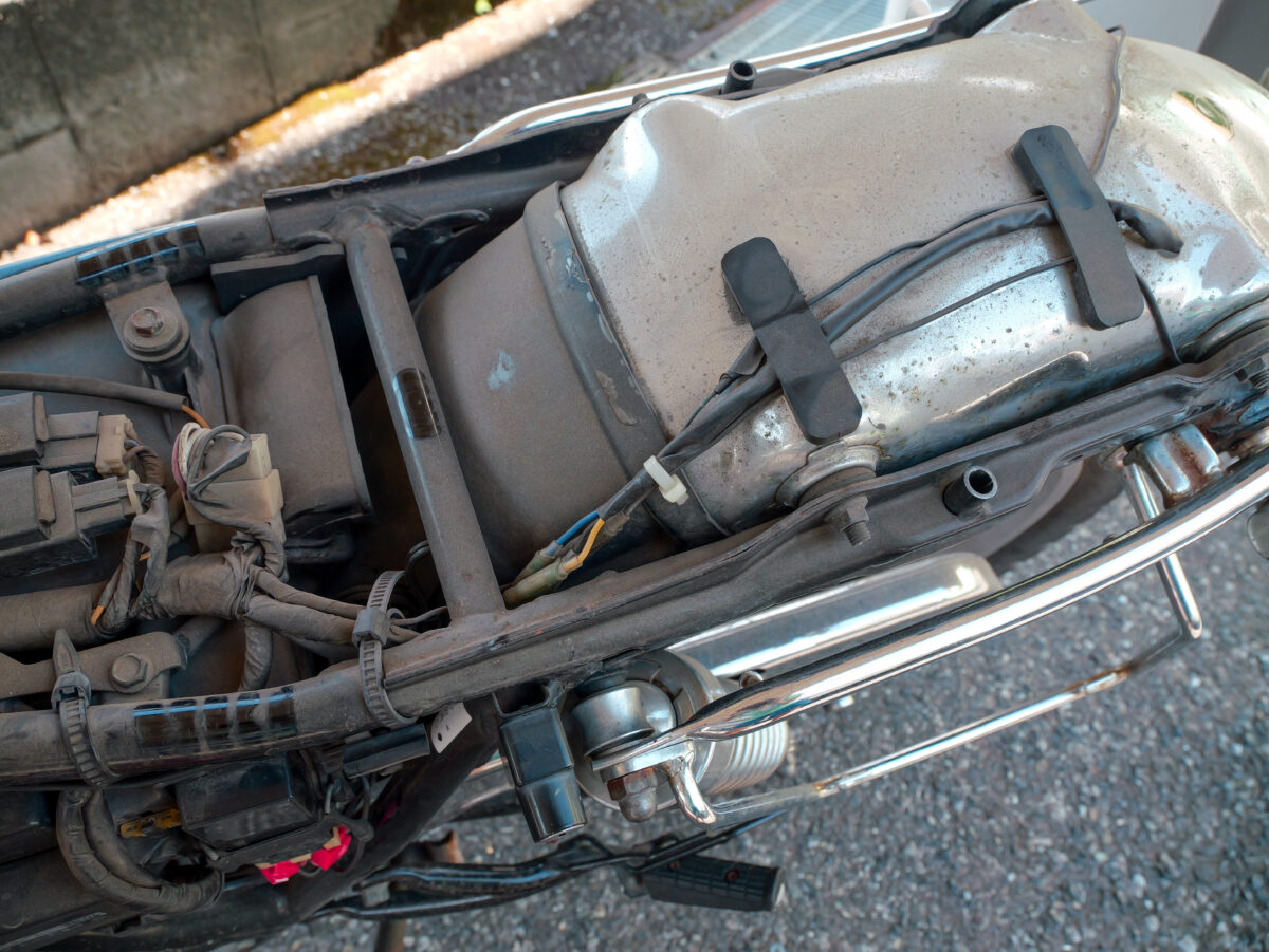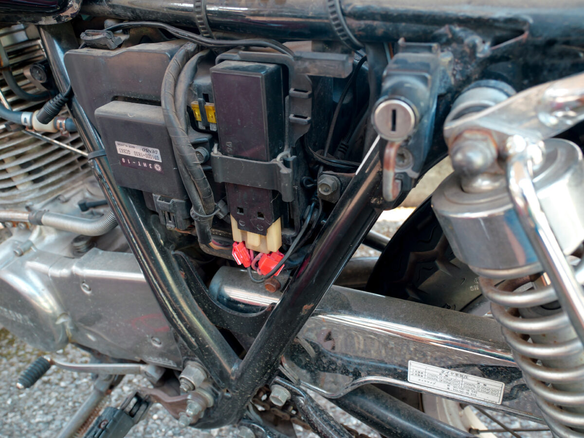ここの配線のキモとなるのはキーオンで連動するアクセサリー電源をどこから取ってくるかだ。バッテリー付近に最初からアクセサリー電源が用意されているような車両でない限り、メインハーネスから車体前方と後方に分かれた配線から見つけてくるのがセオリー。しかし、ヘッドライト内部の前方から取ってくる場合はアクセサリー電源用の配線だけ単独でやたらと長くなってしまうので、私のSR400の場合はバッテリーの上にあるリアフェンダーから飛び出たテールランプの常備灯(スモールランプ)の配線から取り出すことにした。