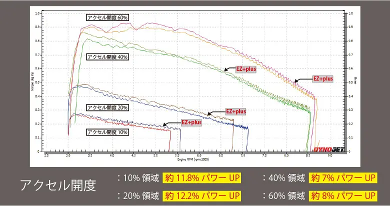 このグラフはEZ+plus未装着と装着のトルクの発生具合を比較したもの。アクセル開度10%/20%/40%/60%という低中速域で、それぞれ明確なパワーUPが確認されている。