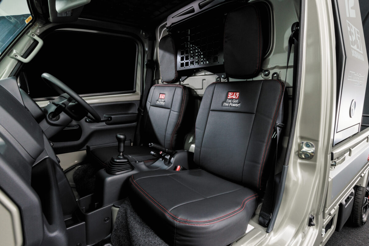 加えて、〝ヨシムラ〟とワンポイントの刺繍が施された汚れや水に強くメンテナンス性に優れたシートカバーも用意。無骨な軽トラにスポーティな個性を加えてくれる。