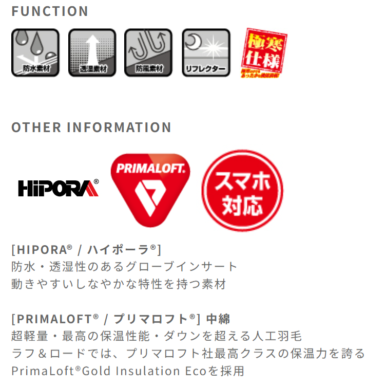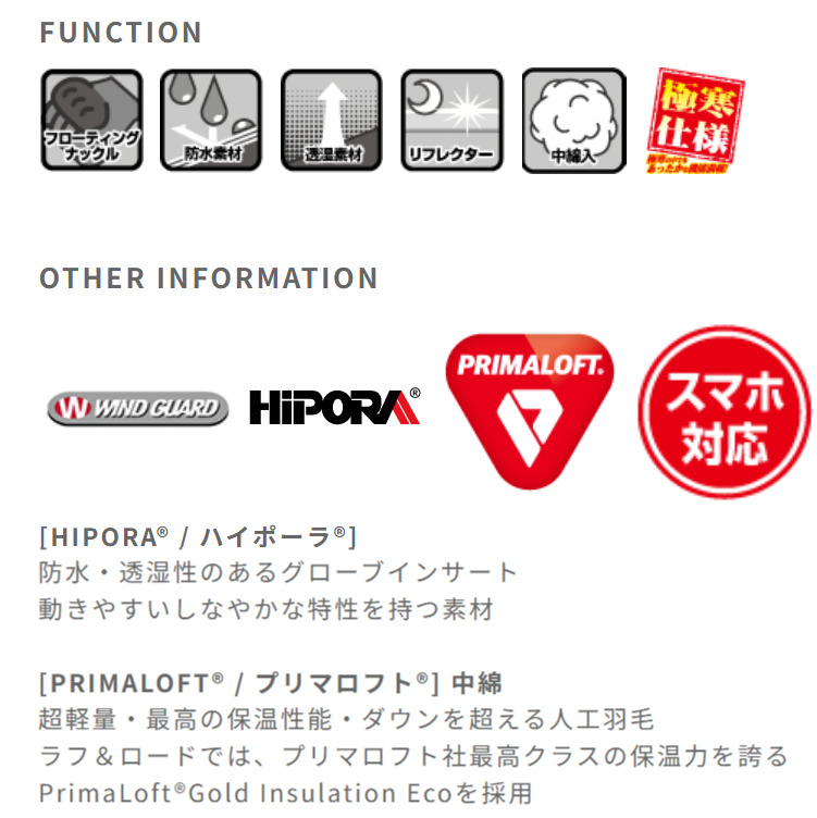 表には薄手ながら高い防風性を持つ「ウインドガードファブリック」を採用することで、外気をシャットアウト。ナックル部と指の関節部にラバープロテクターを内蔵しシンプルながら高いプロテクション性を実現。中綿には軽く撥水性の高い高機能な「プリマロフト®」を使用し、手首部分の内側にボアを備え防寒性能も最高レベル。HIPORA® グローブインサート採用で防水も万全、 手のひらに耐久性、プロテクション性の高い牛革を使用したデイリーからツーリングまで軽やかにこなす、マルチパーパスな万能型ウインターグローブです。