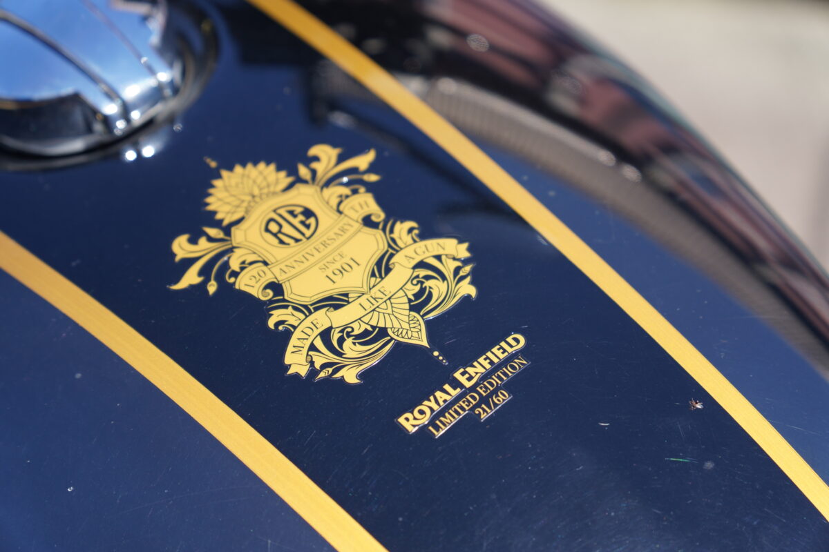 ロイヤルエンフィールド創業120周年モデル(リミテッドエディション)なので、シリアルナンバーが付いているところです。日本に14台くらい(?)しか入っていないらしく、プレミア感にひかれて購入しました。
