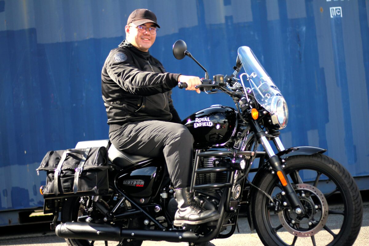 このメテオ350が初バイクです。マウンテンバイクが好きで、高校生のときにオートバイにずっとあこがれていました。アニメ『ゆるキャン△』を観てバイク+キャンプをやりたくなって免許を取りました。