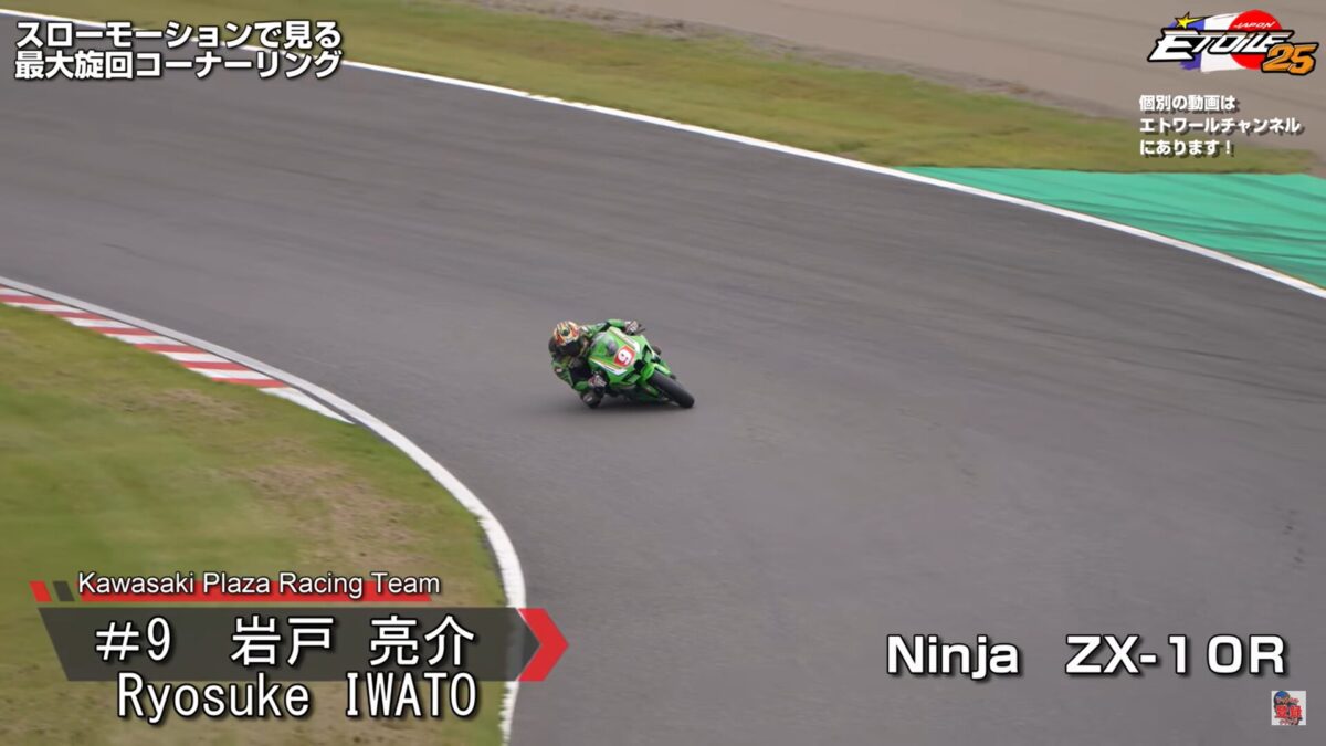 岩戸選手は、長身を生かしてZX-10Rを操っています。マシンがグイグイ曲がっているというよりは、ライダーがしっかりと減速をして曲げている。立ち上がりも直線的です。