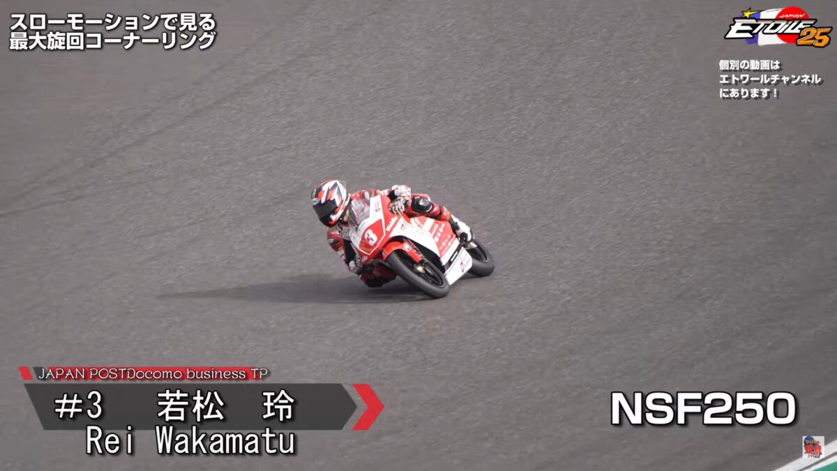 この日、ポールポジションを取った若松選手は、スピードを落とすことなく、アウトいっぱいまで膨らむライディングを見せていました。コーナーが視界に入った時点でマシンを倒し込み、最大限に旋回しています。このような走りは「曲がり切れる」という自信がなければできるものではありません。