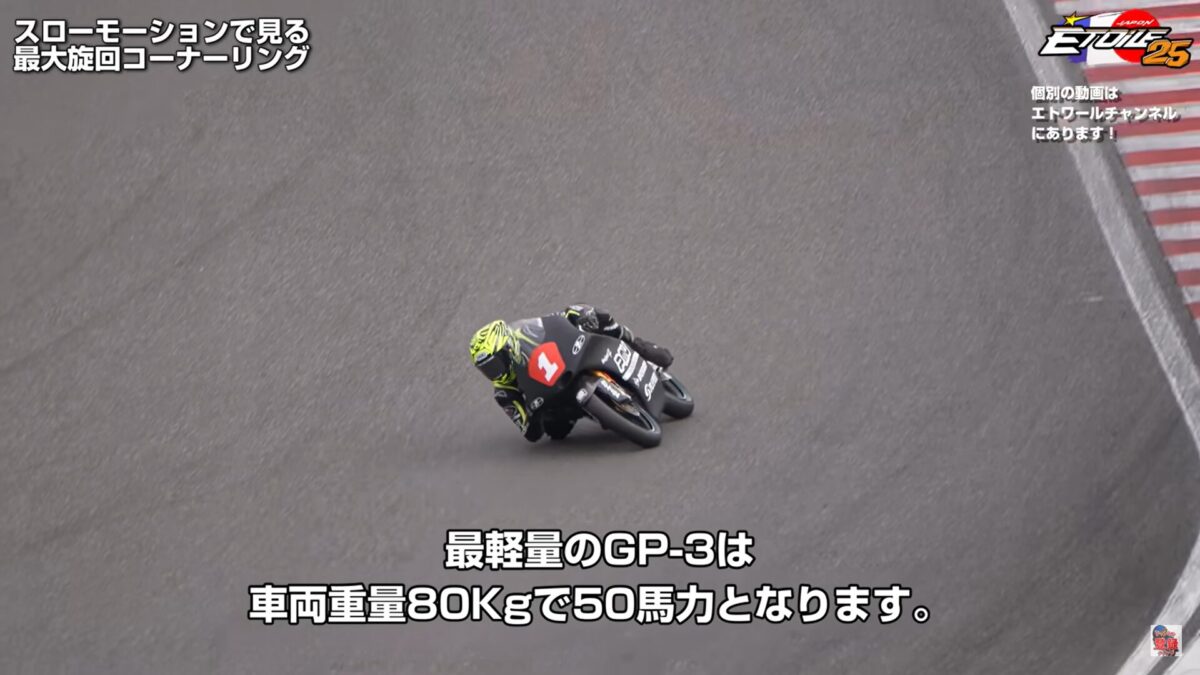 GP-3クラスは、車重約80kg・最大出力50馬力と軽量です。大排気量マシンに比べて大きくラインを取らなくてはなりません。最高速が高くないため、直線よりもコーナリングが頑張りどころ。マシンを安定させてタイヤの力を引き出し、ベストな状態で旋回することが必須です。