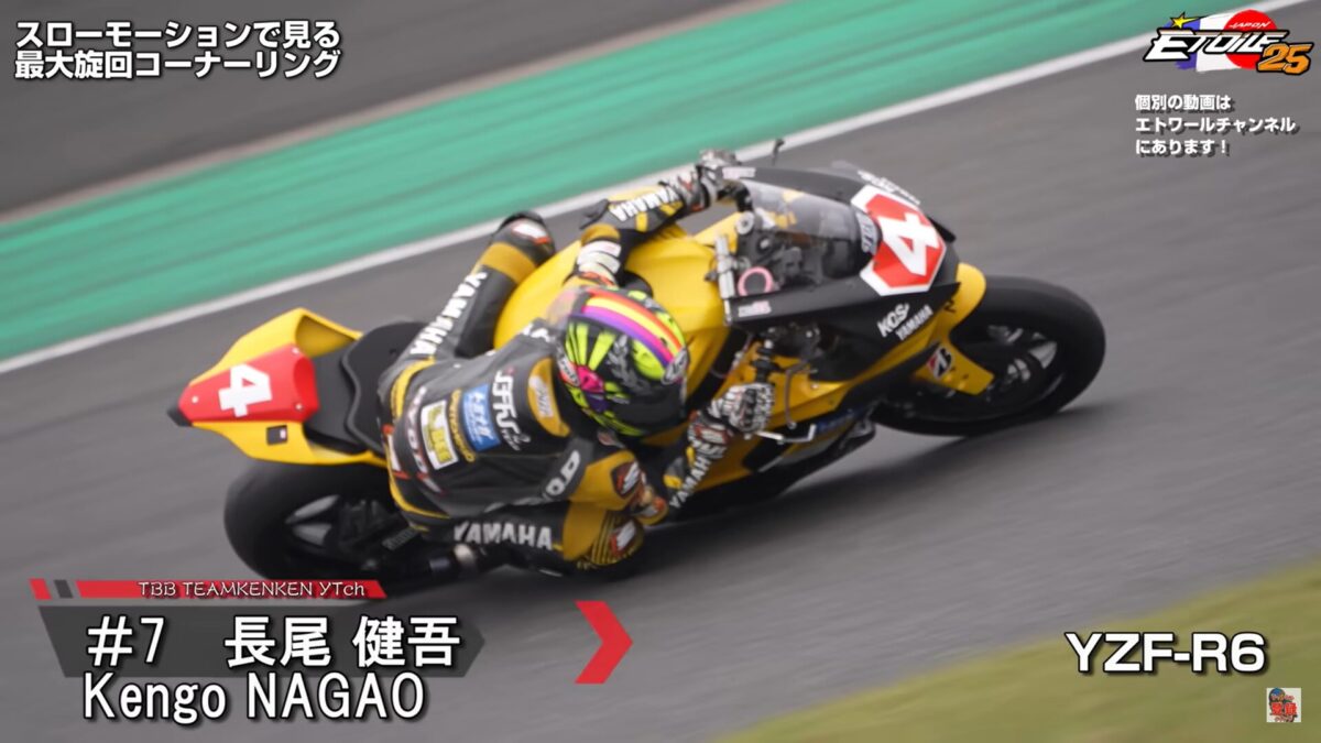 長尾選手は、大柄な体を活かしてビシッとタイヤに荷重を伝え、マシンを安定させています。R6はフロントから旋回する特性があるようで、コーナリングするライダーの頭の位置が低く、前方に飛び出しています。