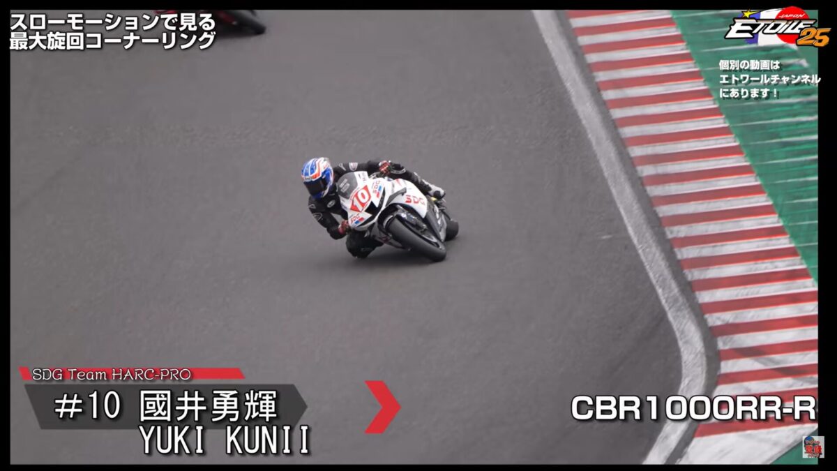 ハイスピードから減速するため、難易度がグッと上がりますが、國井選手はいとも簡単に曲がっているように見えます。フロントフォークとブレーキキャリパーはノーマルを使用。そのあたりはJSBと大きく異なります。