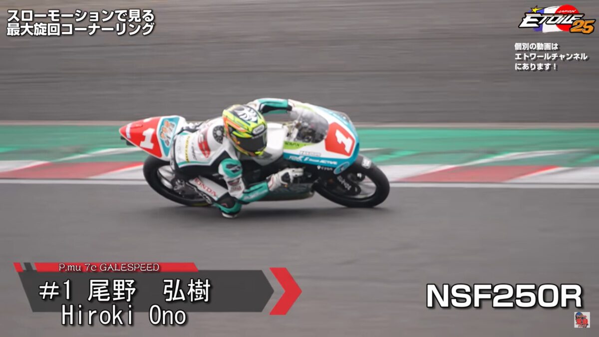 尾野選手は、ボトムスピードを落とさないように操作しています。第1コーナー進入まで時速220km近くも出ているにもかかわらず、コーナーの手前でブレーキング。小刻みに挙動をコントロールしながら曲がる姿が印象的です。
