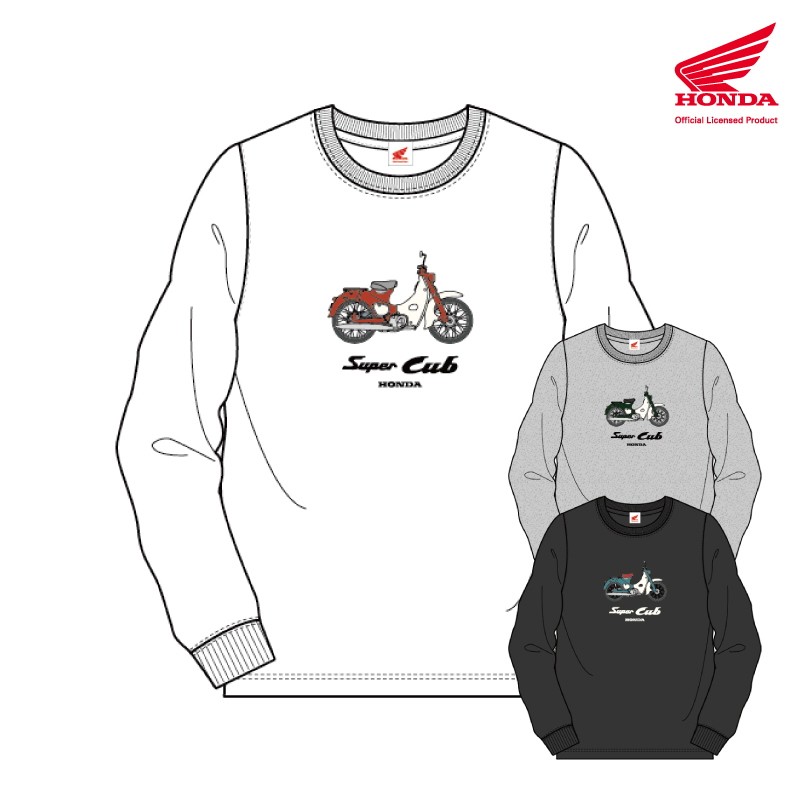 程よい厚みの長袖Tシャツに、スーパーカブのロゴとイラストが入った、カブ好きにはたまらないデザイン。カラーラインナップはホワイト、グレー、ブラックの3色となっており、それぞれ異なるカラーのスーパーカブがプリントされ、1枚で着用しても様になるアイテムだ。サイズはM,L,XLの3サイズ展開、価格は4,950円(税込)である。