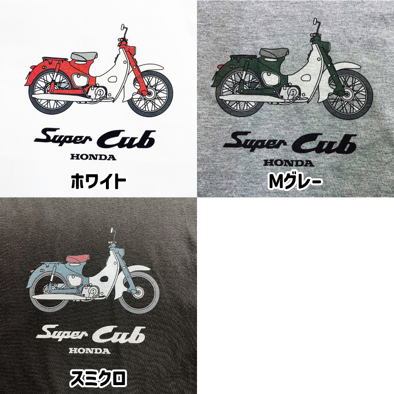 カラーラインナップはホワイト・グレー・ブラック。それぞれ異なるカラーのスーパーカブが印刷されている遊び心のあるデザインに仕上がっております。