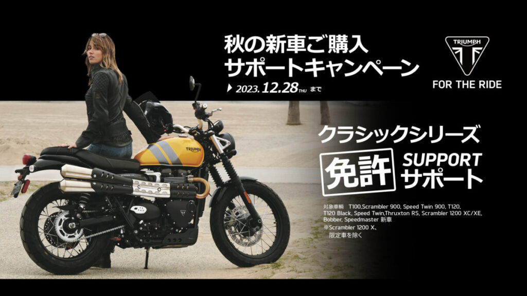 トライアンフモーターサイクルズジャパン株式会社(本社:東京都港区海岸 代表取締役社長:大貫陽介)は現在、10 月1日~12 月 28 日までの期間中、「秋の新車ご購入サポートキャンペーン」を全国のトライアンフ正規販売店において開催し、新車ご購入のお客様を後押しするキャンペーンを開催することをお伝えします。