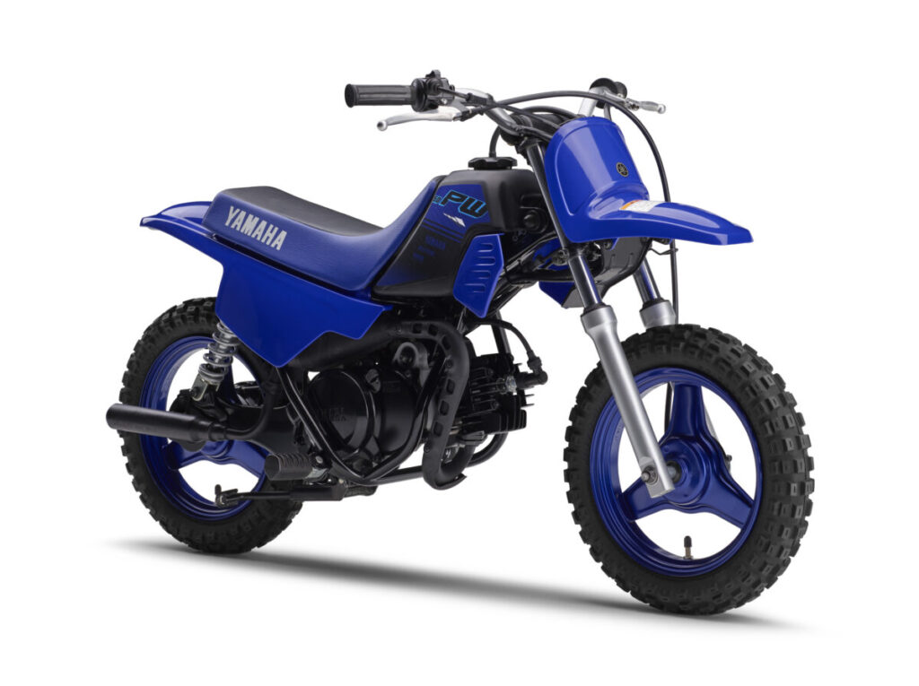 「PW50」は、体重25kg以下の子ども向けオフロード入門モデルで、初代から40年以上続くロングセラーモデルです。主な特長は、1)スロットルの簡単操作で走るオートマチックエンジン、2)扱いやすい軽量・小柄な車体、3)メンテナンス負荷の少ないシャフトドライブ、4)自転車と同じ操作の左右レバー式ブレーキなどです。