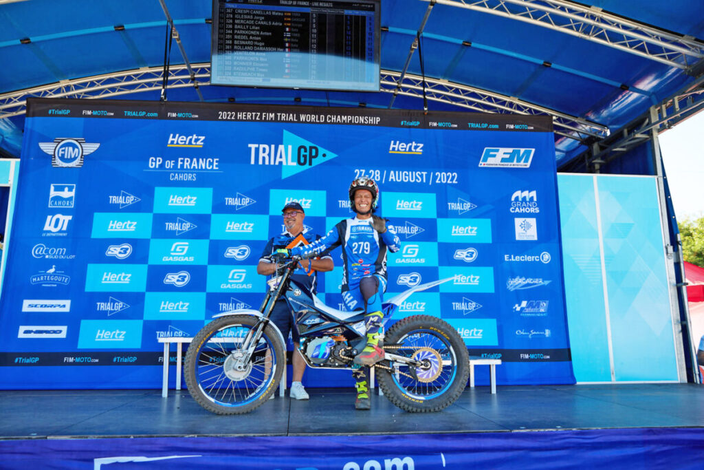 2022年8月27~28日、フランス南部の都市、カオールで行われたFIMトライアル世界選手権の第5戦フランスのTrial 2クラスに、ヤマハ発動機の電動トライアルバイク「TY-E2.0」で「YAMAHA FACTORY RACING TEAM」の黒山健一選手が出場し、2ラップ目の中盤にマシントラブルがあり、31位となりました。
