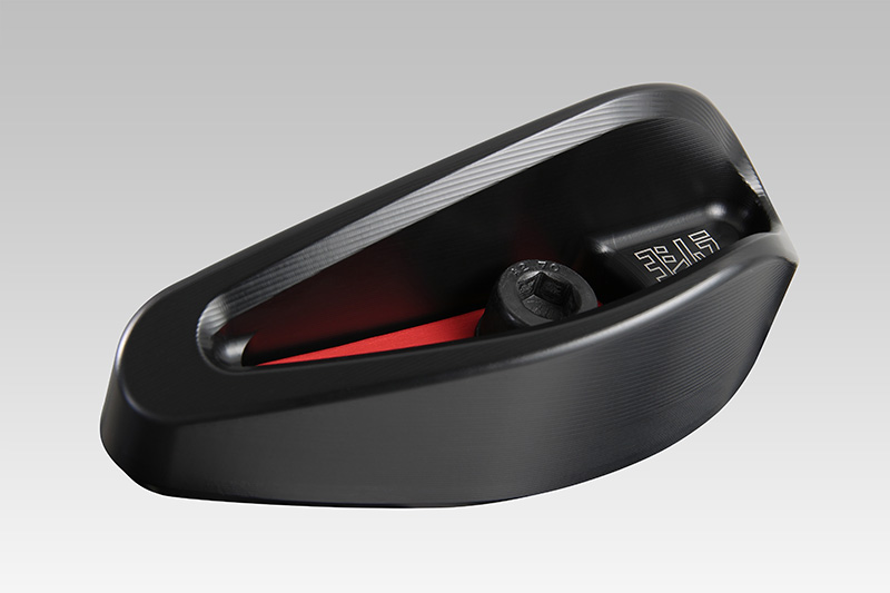 エンジン形状に合わせて強度の確保とデザイン性を考慮して設計されています。高精度に削り出されたアルミカバーは金属光沢が美しいブラックにアルマイト加工され、エンジンとの一体感を高めています。