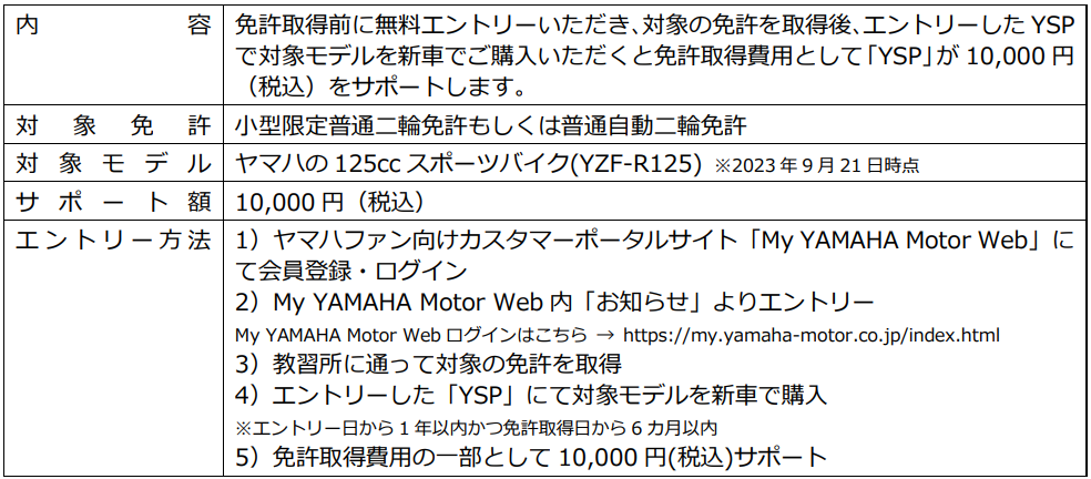 これまでも「YSP」では、二輪免許を取得される方のバイクライフの第一歩を後押しするため、126cc以上のヤマハ新車バイクの購入者を対象に、免許取得費用の一部として 20,000 円をサポートする「YSP