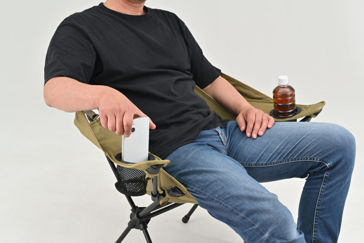 ひじ掛けの左右にドリンクホルダーを搭載しており、手元に飲み物を置いても安定感があり、アウトドアのひとときに便利。スマホなどちょっとした小物入れとしても使用可能です!