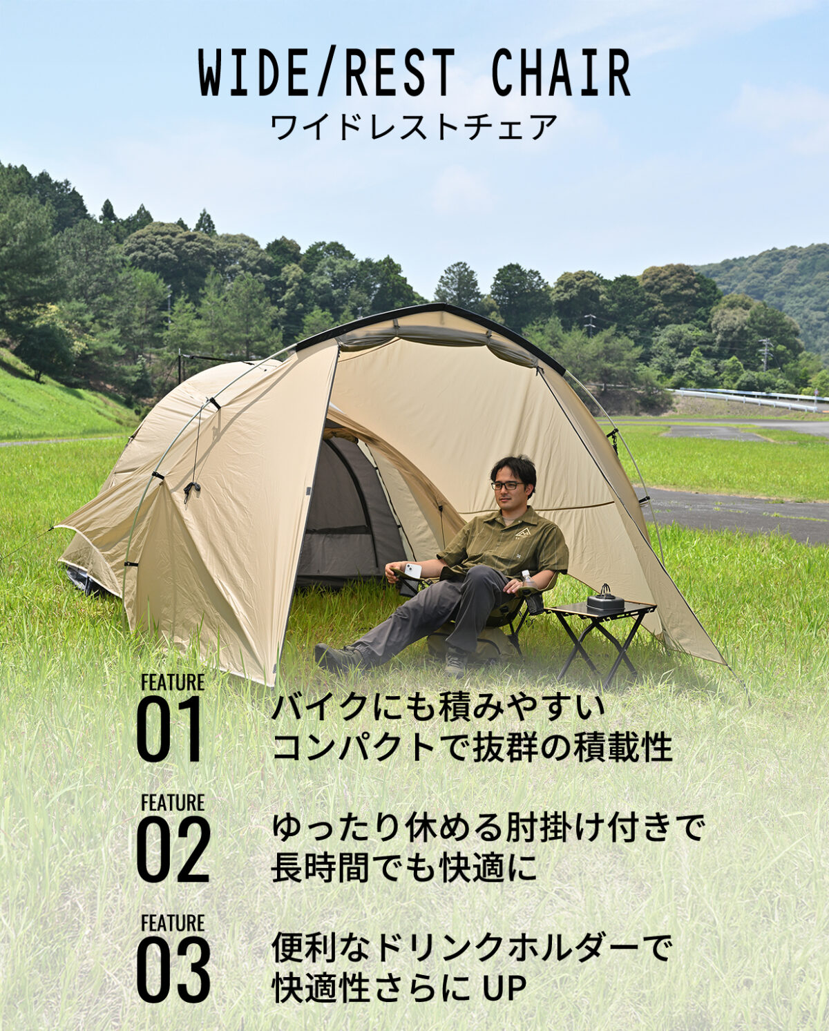 コンパクトさと快適さを両立させた新しいスタンダードチェア。キャンプやアウトドアシーンで長時間座ることが多い方に最適な設計です。このチェアは、他にはない「ひじ掛け付き」で座り心地に差をつけます。キャンプで、椅子に座っている時間は意外と長いものにもかかわらず、軽量コンパクトなチェアには「ひじ掛け」がないことがほとんどですが、ワイドレストチェアは、両サイドにしっかりとしたひじ掛け付きです。